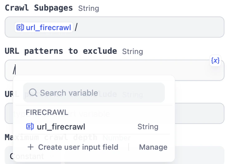 非共享输入 这类输入适用于每个数据源及其下游节点,用户只需在选择对应数据源时填写这些字段,比如不同数据源的URL。 创建方式:在数据源右侧点击”+“按钮,为该数据源添加字段。这个字段只能被该数据源及其后续连接的节点引用。